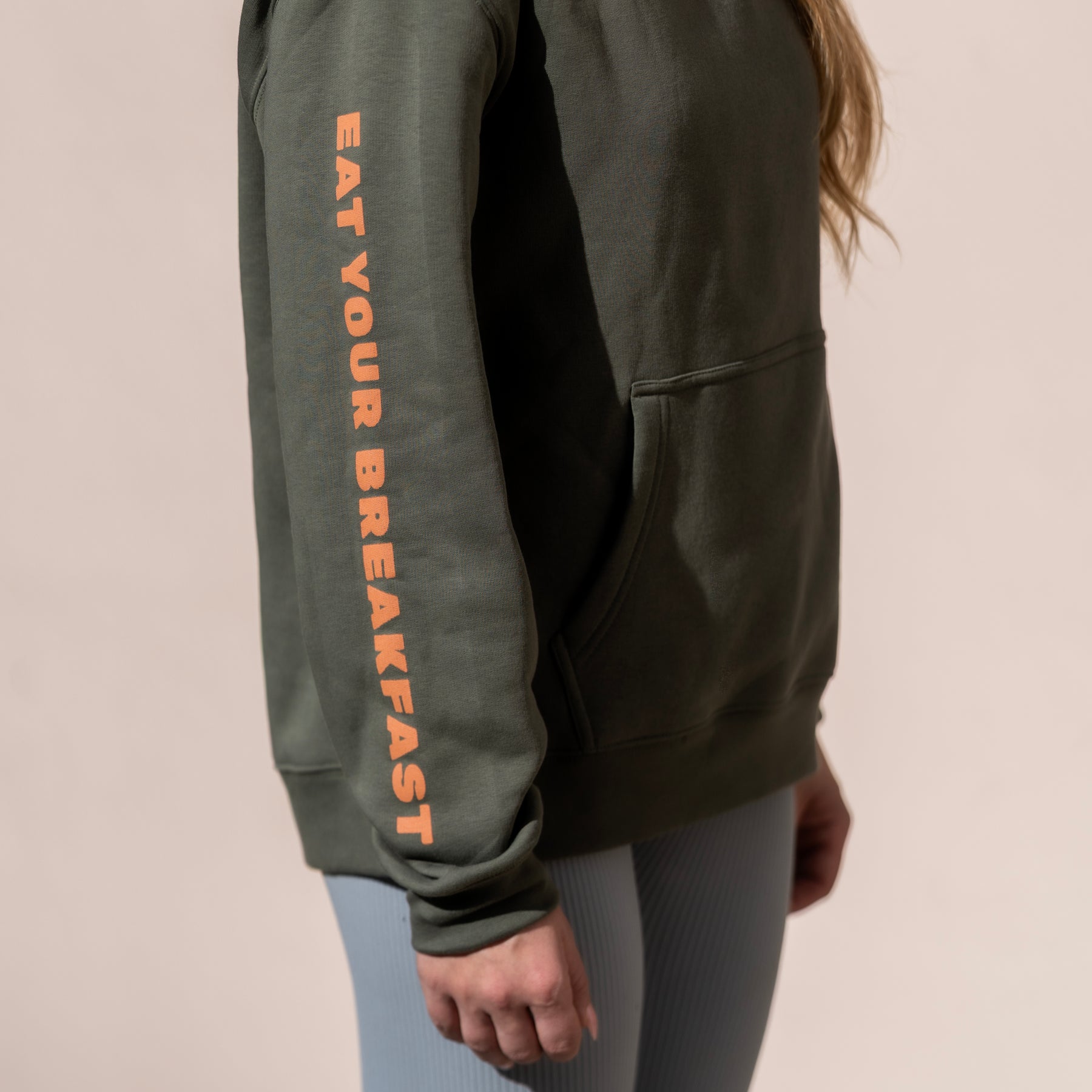 A cozy Cypress Ascolour 5161 hoodie made from an 80% cotton, 20% recycled polyester CVC fleece, featuring “Eat Your Breakfast” and a B.E.C. sandwich graphic stacked with all the fixings - perfect for anyone who likes their comfort hearty and their style served fresh.